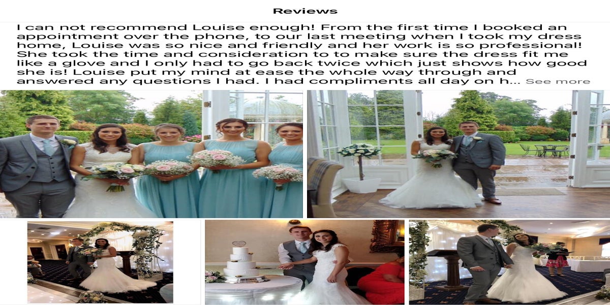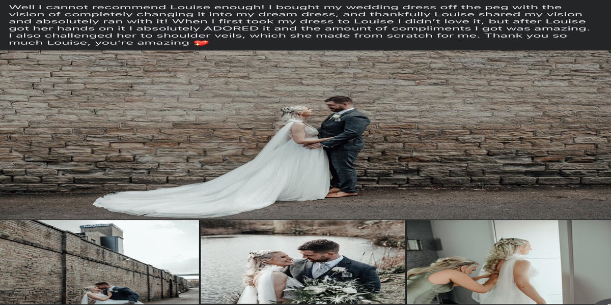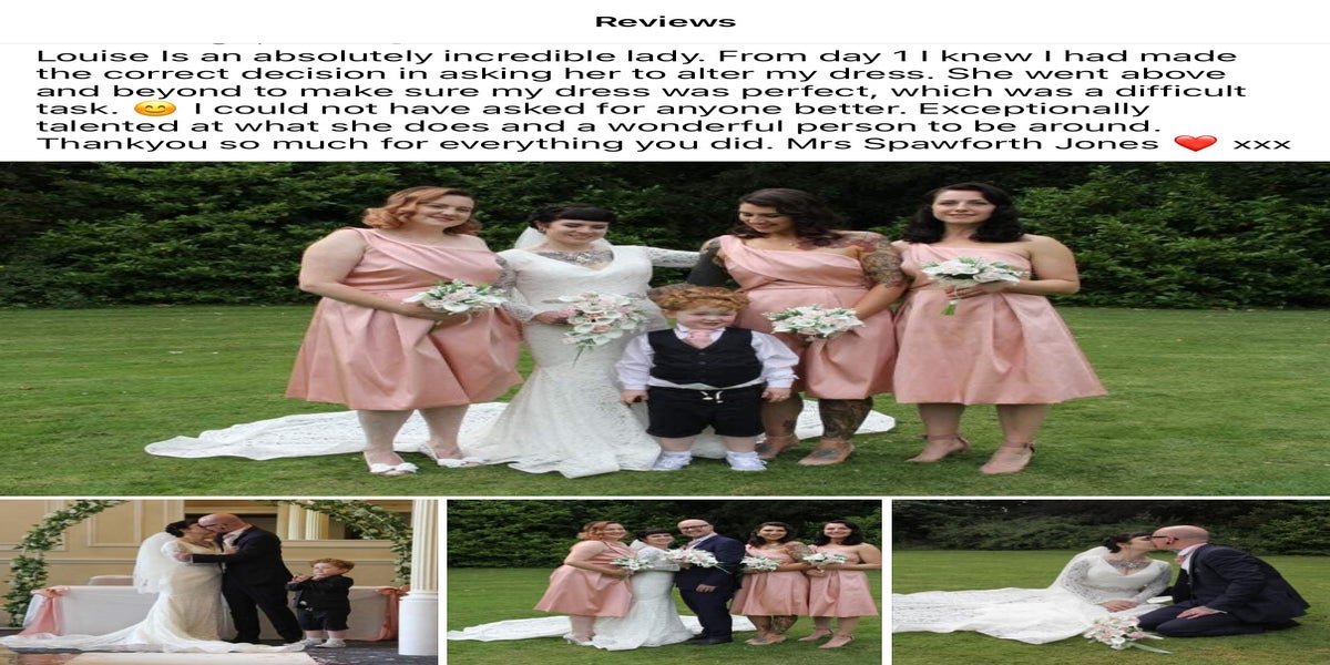 Louise was lovely from start to finish, she made me feel at ease the whole time she had my wedding dress. I lost weight quite fast and she ended up taking my dress in a few inches just days before my wedding. The adjustments and alterations made ended up being perfect. Very fairly priced too, thank you. Would definitely return